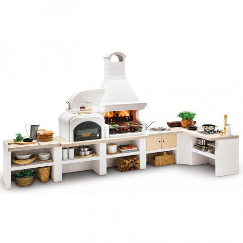 Выполнена из совместимых модулей. Столешница из полированного камня Marmotech. Основания всех модулей имеют заднюю стенку. Стальная решетка для дров и решетка из нержавеющей стали 76х40 с бакелитовыми ручками. Общие размеры: 450х85х218 cм.