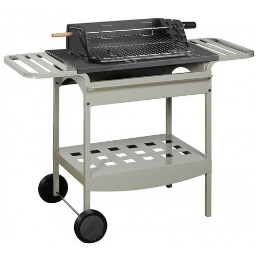 Большой контейнер очага. Легкая мобильная металлическая платформа. По бокам две деревянные полочки-рабочие поверхности. Несколько вариантов регулировки решетки по высоте. Решетка для разогрева, подставка для посуды. Разнообразные варианты положения шампуров. Нижний сервировочный столик. Решетки, двигатель, вертел в комплекте поставки.