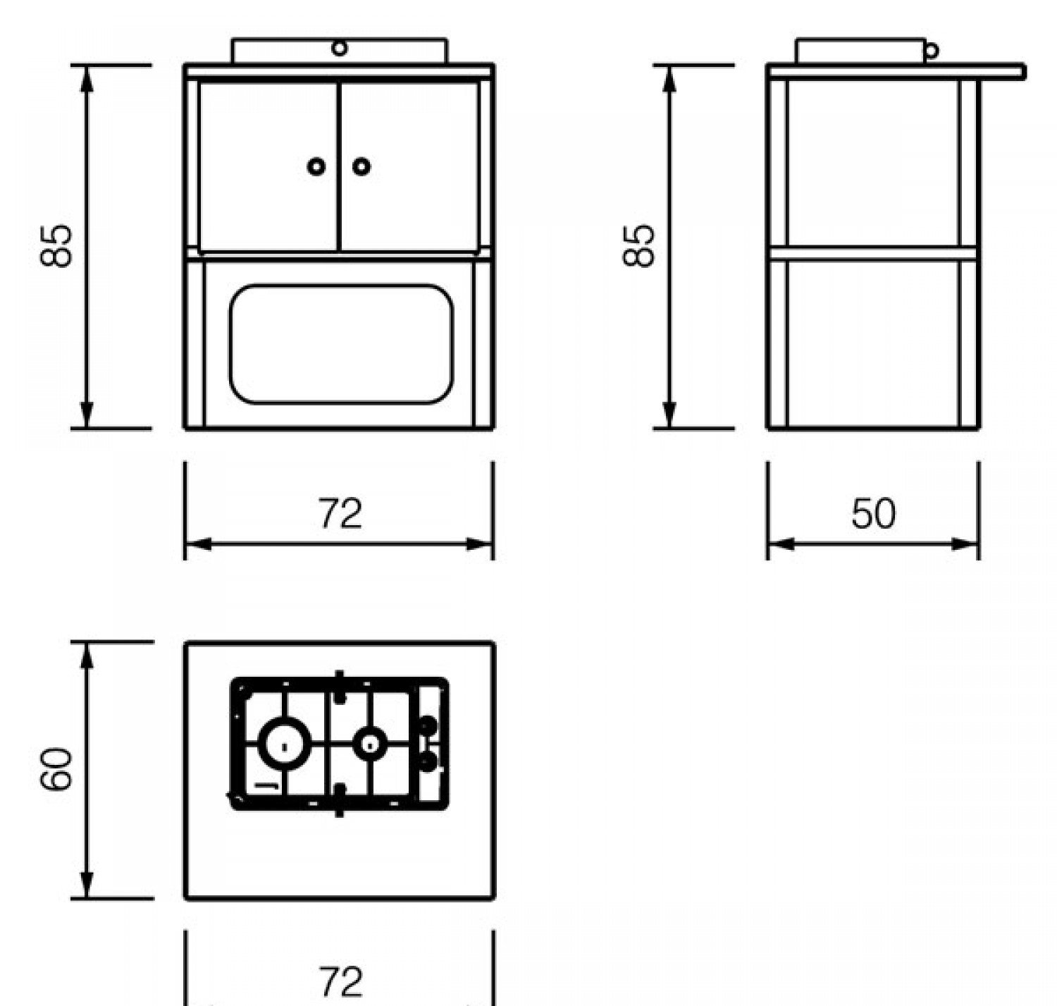 Модуль "газовая плита" 2 конфорки. Изготовлена из нержавеющей стали, с комплектом стальных дверец.