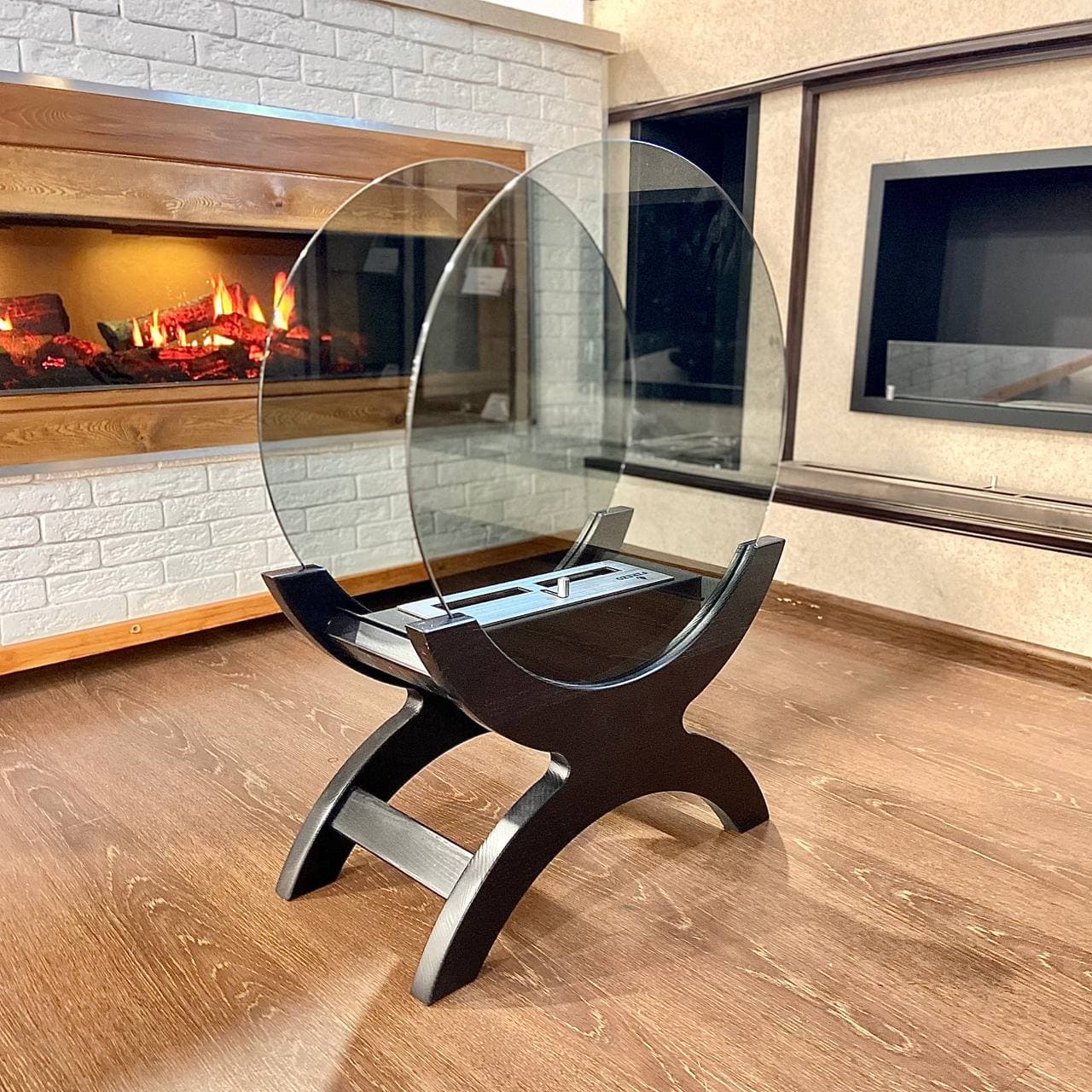 Отдельностоящая напольная модель. Состоит из основания изготовленного из дуба. Корпуса топливного блока. Два защитных термостойких стекла.