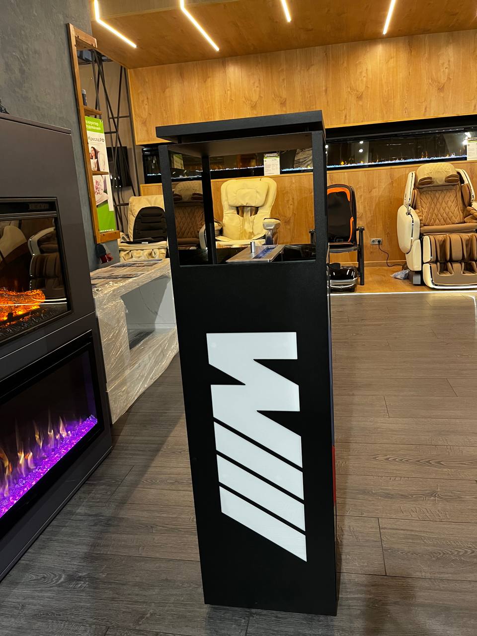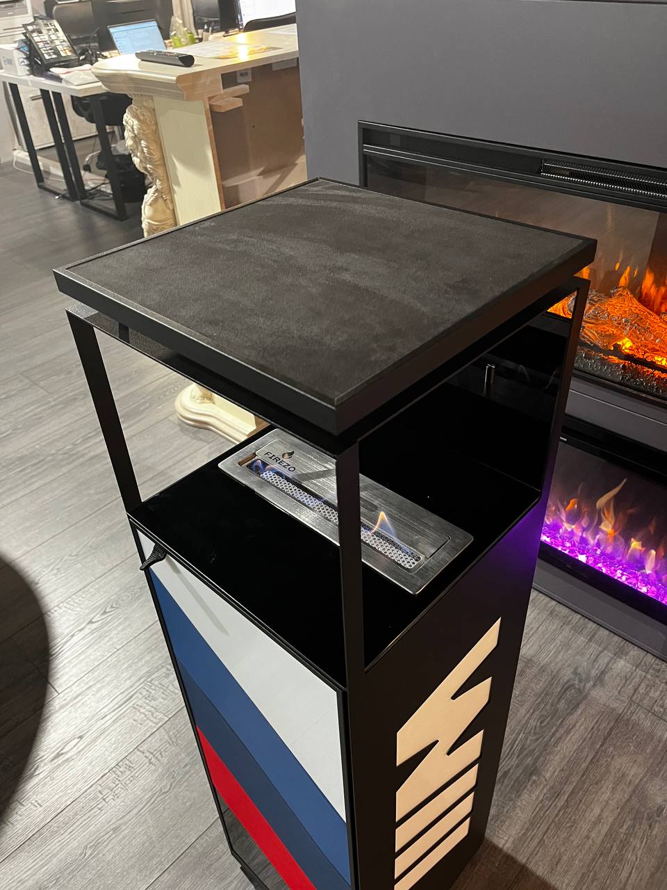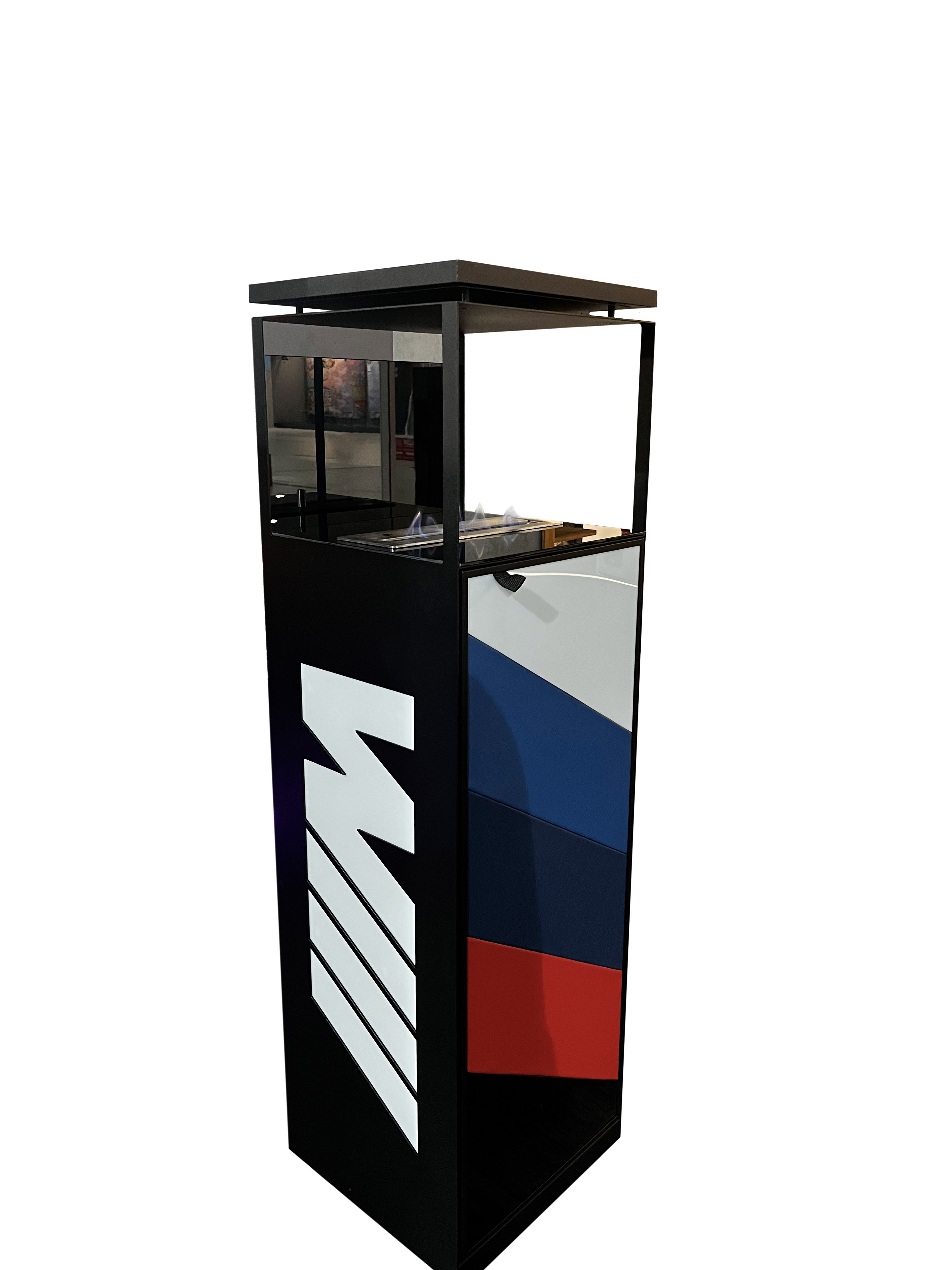 Уникальный биокамин – Firezo M Performance отражает стиль и дизайн немецкого автомобиля. Металлический каркас и стенки из дерева гармонично сочетаются с накладками из эко кожи и алькантары. Также внутри камина мы сделали мини бар – это точно удивит!