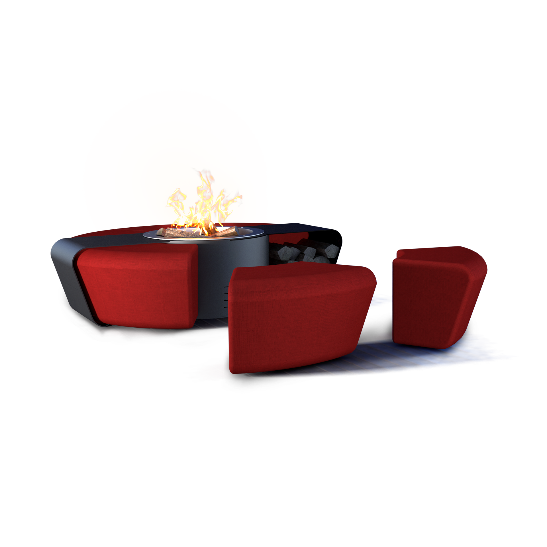 • Варианты отделки корпуса: пуфы, облицованные тканью красного цвета(для использования на улице) + углеродистая сталь, цвет - черный; пуфы, облицованные тканью красного цвета(для использования на улице) +оксидированная кортен-сталь; возможная опция: изменение цвета ткани для пуфов на черный, шафран, мандарин, сапфир, кремовый, коричневый.