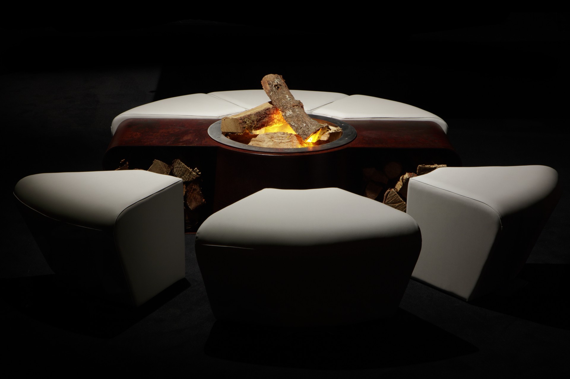 - Горелка из нержавеющей стали БРУЛЁР I + цилиндрическое термостойкое стекло + пуфы, облицованные тканью красного цвета (для использования на улице). Имеется опция: изменение цвета углеродистой стали (по запросу).
