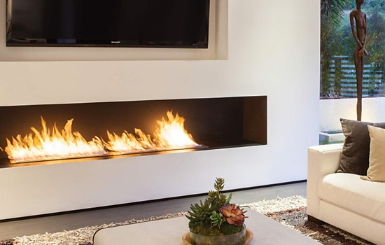 Встраиваемый в нишу стены биокамин. В стене, над камином, имеется дополнительная ниша под плазму.