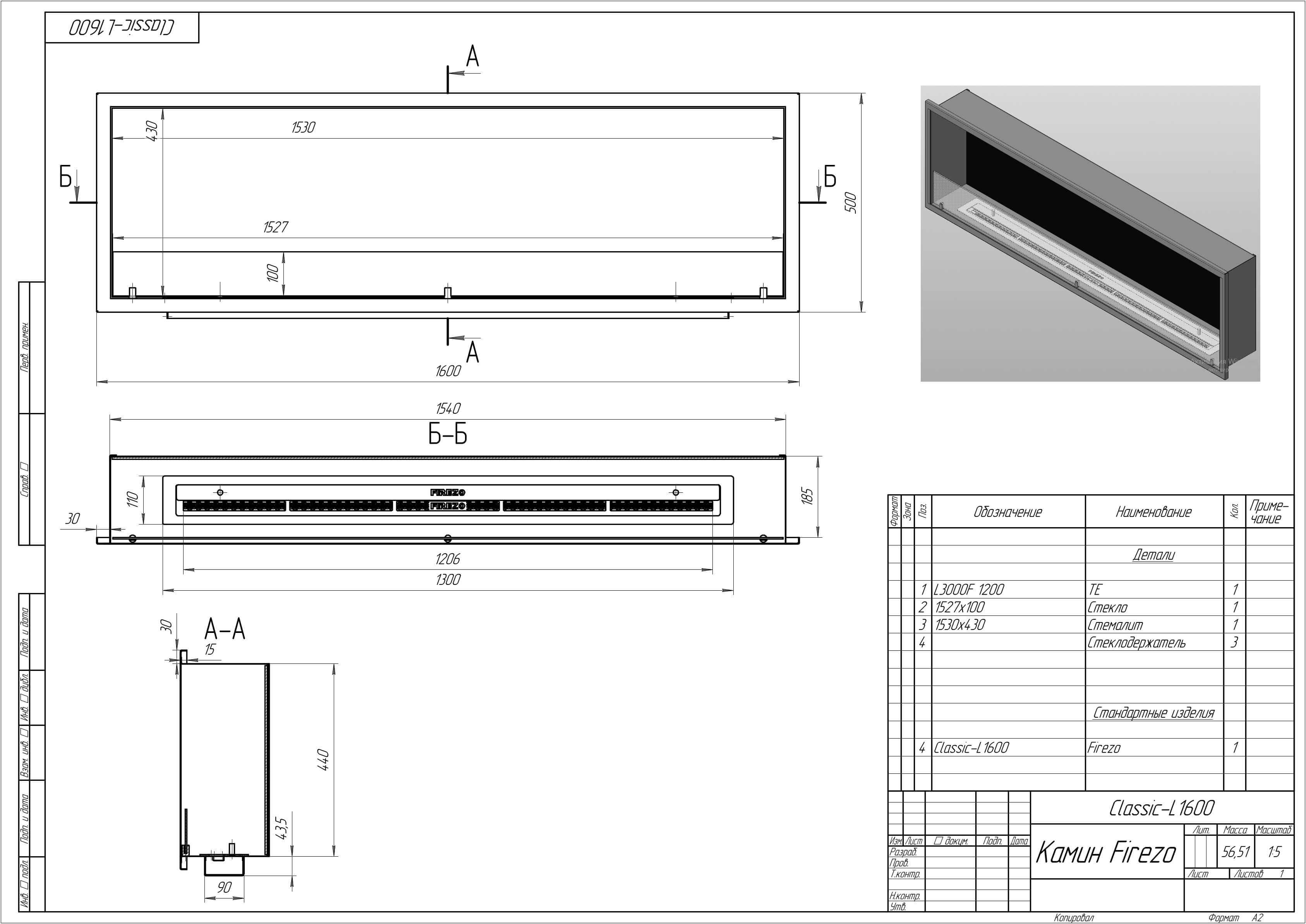 - Базовые размеры камина: 1600x200x500 мм