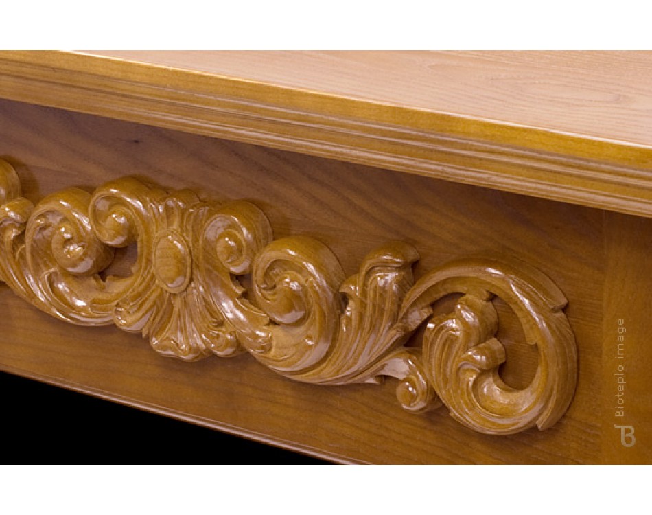 Портал имеет угловую верхнюю крышку и изготовлен из массива натурального дерева.