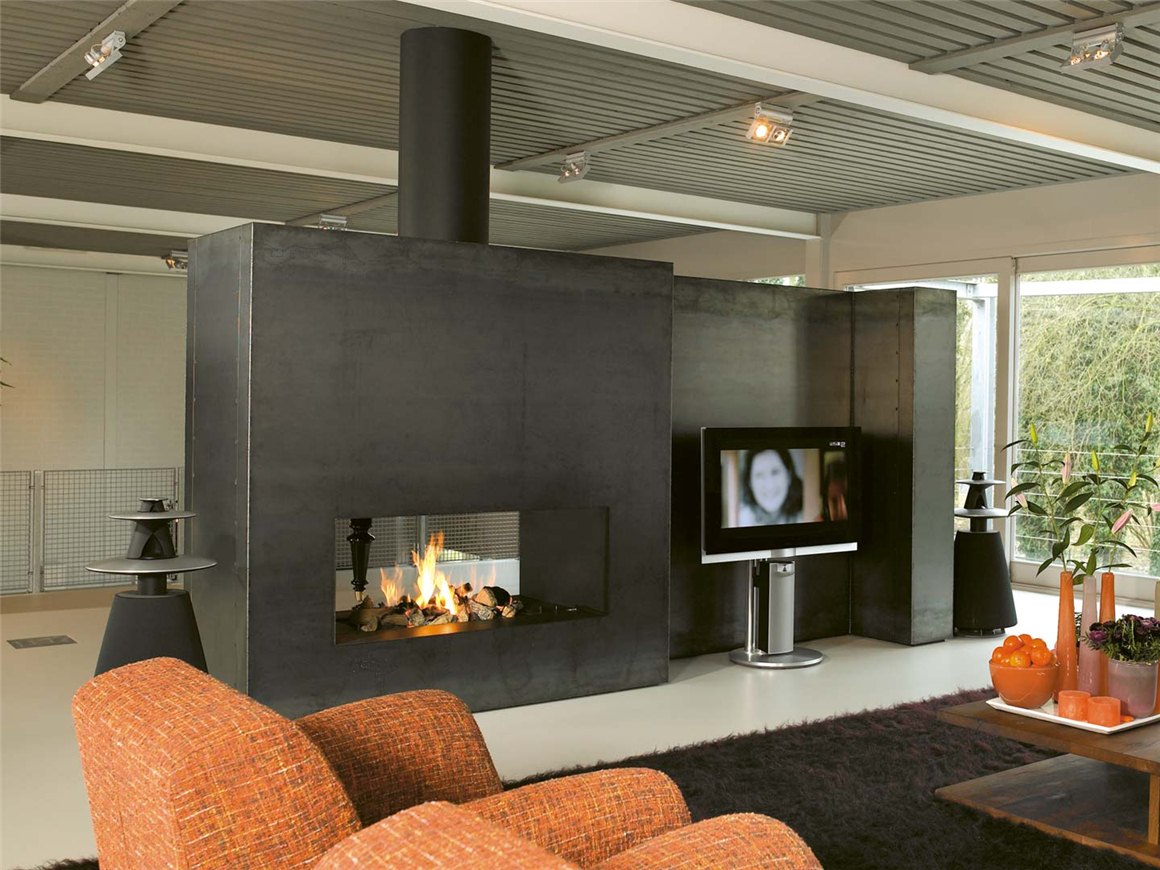 - Оснащен солидным объемным очагом, который способен показать на высоком качественном уровне долгую, качественно построенную работу. Великолепный внешний вид камину добавляет еще и двусторонний просмотр пламени в очаге.