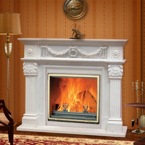Изготовленный в Италии компанией Artevero камин APOLLO устанавливают во внутри помещений. Генерирует тепло от сжигания древесных чурок. Фасад и боковые стороны декорированы белой плиткой с вязью на верхней фронтальной части, расположенной над топкой. По архитектурной композиции можно отнести к классическому стилю. В качестве материала использован натуральный камень: бучардированный мрамор светлого цвета.