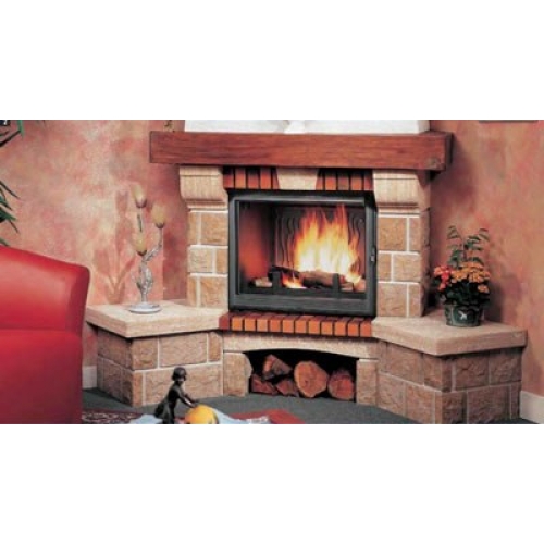Угловой камин Axis Se Lavandou с дровником и двумя банкетами, балка - массив дуба. Pierre marbriere preassemblee + Gard + bricks Cevennes + cheng