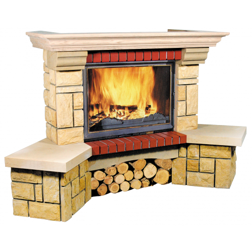 Бюджетная облицовка Bella Italia Marta выполнена в стиле прованс из золотисто-песчаного кварцевого песчаника, топка контрастно обрамлена красно-терракотовым клинкером узкого формата. Основная масса камина сложена из разноформатных колотых блоков. Детали: профилированный карниз, арочка над нишей для дров и плита подиума тщательно отшлифованы, благодаря чему камень приобретает более светлый оттенок. Завершает композицию широкая дубовая каминная полка-карниз.