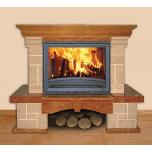 Облицовка и декоративные элементы выполнены из колотого мрамора  Декоративная деревянная балка служит небольшой полочкой. Предусмотренно место для хранения дров.