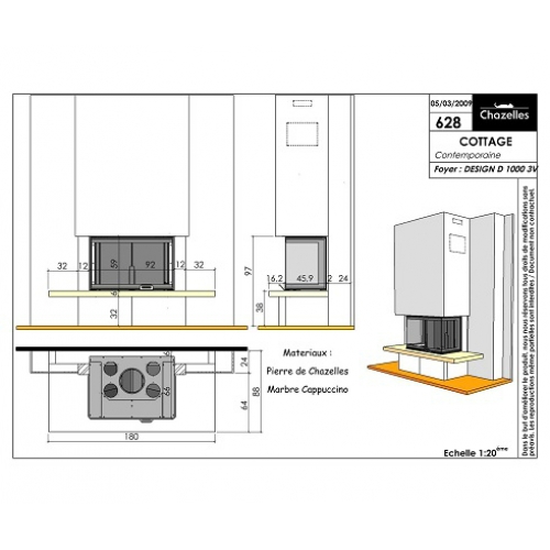 Пристенный трехсторонний камин Chazelles Cottage - это элегантная модель, выдержанная в стиле модерн. Модель изготовляется из высококачественных и долговечных материалов, а также проходит множество тщательных проверок и тестирований на соответствие всем государственным и международным стандартам качества. Фирма-производитель модели находится во Франции. Пристенный трехсторонний камин Cottage изготовляется из прочного декоративного шлифованного мрамора цвета капучино. Главное призвание пристенного каминного портала Chazelles Cottage - это создание тепла, домашнего уюта и романтики долгими темными вечерами. Благодаря оригинальному современному стилю, камин отлично сможет вписаться в самые разные стили интерьера, как современные, такие, как хай-тек, минимализм, конструктивизм, арт-деко, так и классические, включая модерн, классицизм и эклектику. Подходящие топки: D10003V Особенности каминной облицовки: Пристенный камин Мрамор декоративный шлифованный блестящий цвета капучино. Камень Chazelles. Технические характеристики каминной облицовки: Материал портала на фото: декоративный шлифованный мрамор цвета капучино. Тип портала: трехсторонний. Тип топлива: дрова. Присоединение дымохода: сверху. Диаметр дымохода: 25 см. Общий размер (см) : 180 x 64 x 97. Вес : 310 Кг Возможно исполнение в следующих цветах: