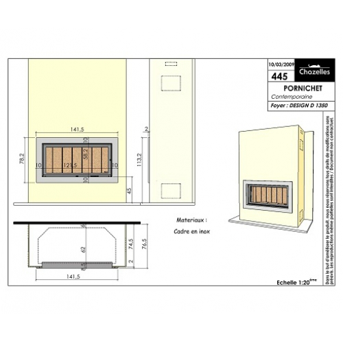 Горизонтальная каминная рамка из нержавеющей стали с полированной поверхностью. Адаптируемая топка с широким огнепрочным стеклом, увеличивающее обзор огня. Подходящие топки: D1000 D1200 D1350 Особенности каминной облицовки: Рамка полированная нержавеющая стальная плоская. Технические характеристики каминной облицовки: Производитель: Chazelles (Франция) Стиль камина: современный Подходящие топки: D1000, D1200 Материал топки: сталь Материал: Сталь Установка камина: встроенный Топливо: дрова Присоединение дымохода: верхнее Диаметр дымохода, мм: 230, 250 Общий размер (см) : 141 x 2 x 78. Топка : DESIGN D1350 Вес : 20 Кг