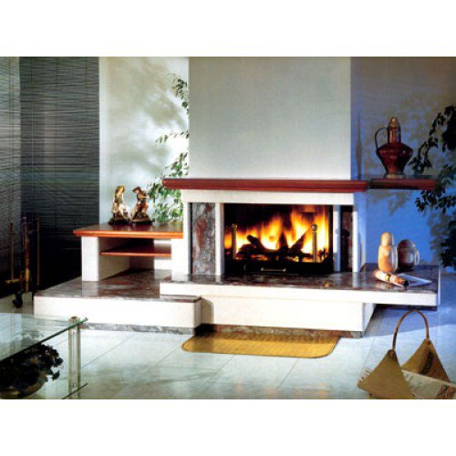 Фронтальный камин выполнен из бучардированного мрамора Becco и полированного мрамора Iride Diverso. Деревянная асимметричная балка. Открытая металлическая топка 070, зольник и колосник.