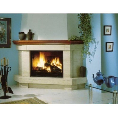 Угловой камин серии Stylo из полированного мрамора Crema Moka. Формированная деревянная балка. Металлическая топка 904, колосник и зольник.