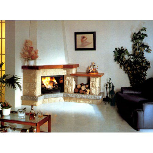 Угловой камин из песчанника Arenisca грубой обработки без шва. Плита из полированного камня San Vicente с неровным кантом. Деревянная балка. Металлическая топка 904 с колосником и зольником.