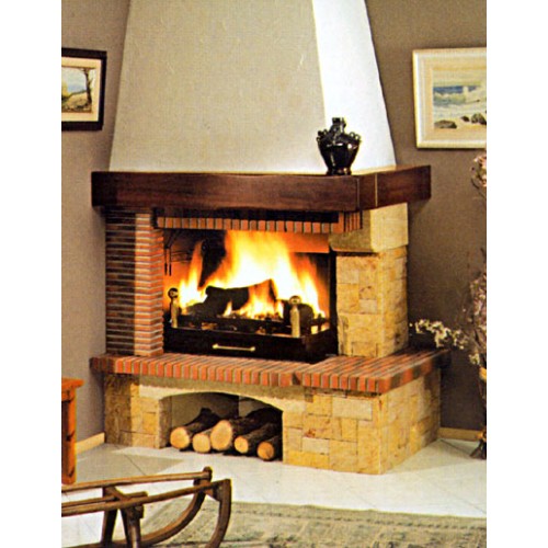 Пристенно-угловой камин из камня/мрамора Rosa Dorado грубой обработки без шва. Боковые детали из кирпича типа Tuilot толщиной 1,5 см. Плиты и консоль из кирпича толщиной 3 см. Быки и консоль дровника из гарскго камня. Деревянная балка из Iroko. Металлическая топка 071, открытая сбоку с зольником и колосником.