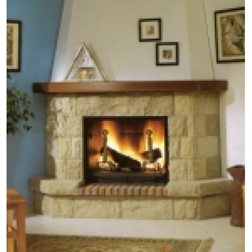 Угловой камин серии Stylo из песчаника Arenisca грубой обработки без шва. Центральная плита из огнеупорного кирпича толщиной 5 см. Металлическая топка 904, колосник и зольник.