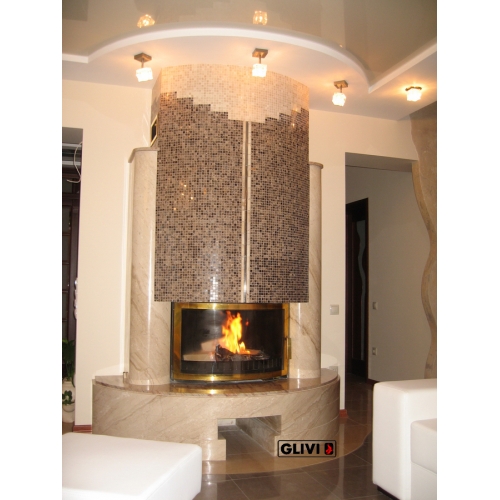 - Камин выполнен из полированного мрамора Breccia Sardo, из гранита Shiwakashi и мозаики из мрамора Emperador Dark и Botticino.
