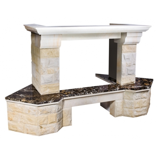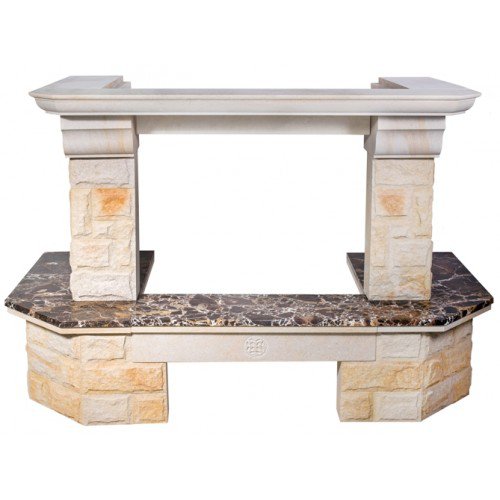 - Материал: колотый песчаник, золотистый цвет, полки - мрамор Emperador GoldПодходящие топки шириной „700 мм” с прямым стеклом