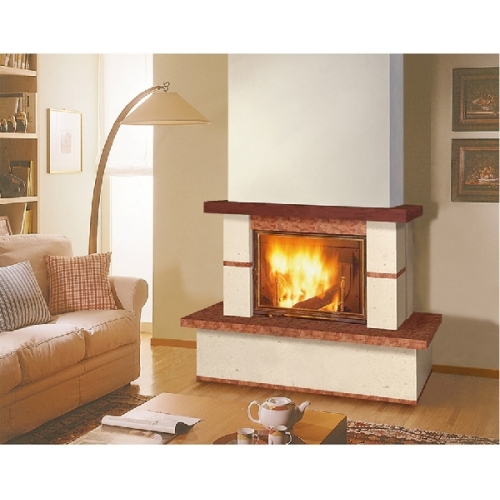 Пристенный камин Palazzetti Anversa из полированного мрамора Bianco Mediterraneo. Столешница и вставки из полированного мрамора Rosso Asiago. Каминная полка из массива сосны под орех.
