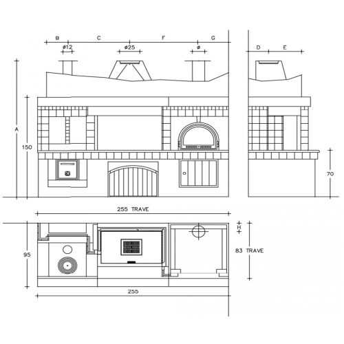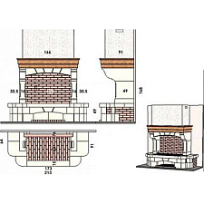 Этот замечательный камин сочетает в себе сразу три очага: традиционную топку со всем необходимым для готовки на открытом огне, топку Chef 72 для готовки пищи и духовой шкаф Le Gourmet. Облицовка камина - из легкого цемента под покраску. Очаг - из полированного мрамора Rosa Asiago. Кожух для кухни отделан эмалированной сталью, а балка, ящик и дверца сделаны из древесины ели.