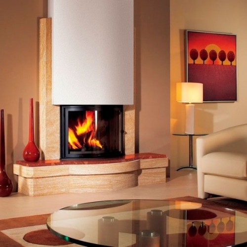 Полувстроенный камин. Изготовлен из камня Castillon + "Rocmarble" Corallin.