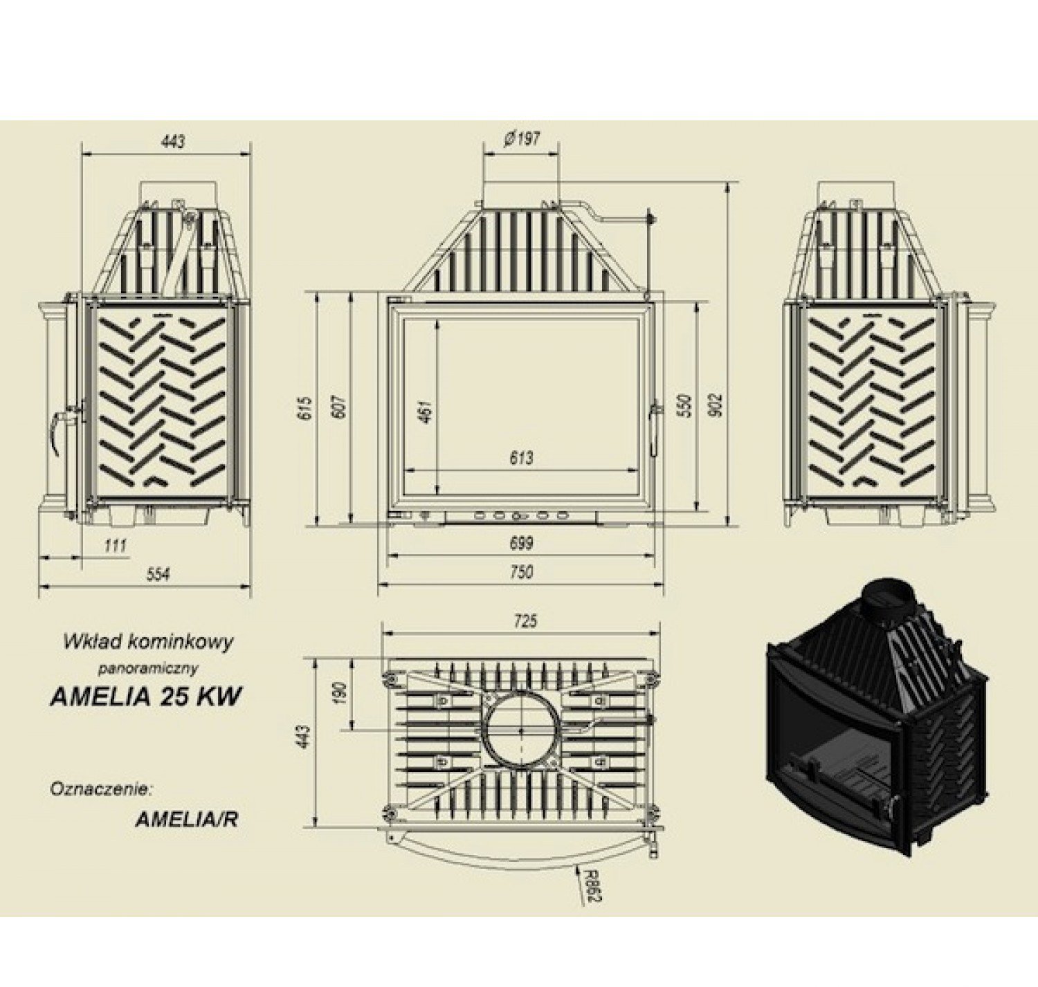 Amelia R (панорама)— топочная камера или топка-вкладыш, предназначенная для отопления дома площадью до250 кв.м. Встраиваемые топочные камеры предоставляют широкие возможности винтерьерном оформлении, кобычной чугунной топке можно подобрать абсолютно любое обрамление— как вклассическом, так ивсовременном стиле. Топки спанорамным стеклом— это не только безопасность, ноипрекрасная возможность наслаждаться игрой пламени находясь внепосредственной близости отогня. Особенности оборудования серии Amelia RотKRATKI: Чугунная топка непрерывного сгорания; Топка высокой мощности, предназначена для больших помещений; Топка спанорамным стеклом; Теплоемкость прибора увеличивают ребра повсему корпусу; Топливо— сухие дрова длиной до500 мм; Стекло— термостойкая стеклокерамика, предел нагрева 800 С; Полная герметичность дверцы; Система «двойного дожига»; Топка имеет съемную ручку надверце; Прозрачность стекла обеспечивает система встроенного обдува; Предусмотрен держатель дров— непозволяет рассыпаться при открытии дверцы; Дно топочной камеры имеет отверстие для золы.