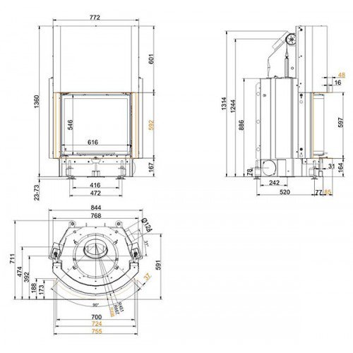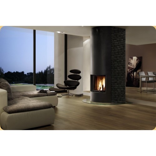 Стальная топка со сферическим стеклом. Подъёмная дверца (система Easy-Lift). Горизонтальное открывание двери для чистки стекла. Ширина дверки 616 мм, высота - 546 мм. Возможно подключение воздуха из-вне. В комплекте поставляется декоративная рамка.