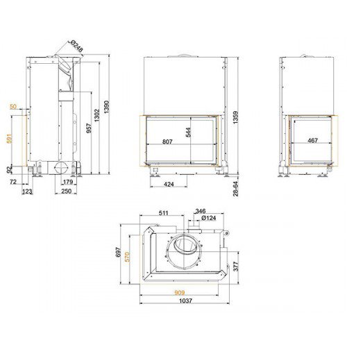 Угловая каминная топка с цельным Г-образным стеклом. Боковое стекло справа. Дверца с подъемным механизмом (система Easy-Lift). Топочная камера футерована шамотом. Ширина дверки 807/467 мм, высота - 544 мм. Возможно подключение воздуха из-вне.