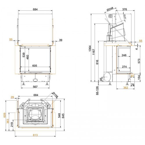 Трёхсторонняя каминная топка. Топочная камера футерована шамотом. Подъёмный механизм двери (система Easy-Lift). Ширина дверки 248/605/248 мм, высота - 492 мм. Возможно подключение воздуха из-вне.