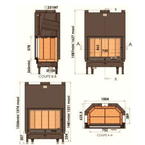Особенности: Топка из стали, дверца открывается вбок и вверх, съёмная ручка. Топка футерована шамотным камнем: чёрным или бежевым. Рамки:полированная нержавеющая сталь/золотистая/чёрная матовая Подключение воздуха снаружи. Вентиляционный набор по заказу. Оборудована Glass Protect System © : (система защиты стекла). Характеристики: Диаметр подключения O230 Общий размер (см) 100,4 x 162,7 x 62,6 Размер стекла ( мм) 544 x 838 x 4 Сажа 73 мг/Нм3 Мощность 20 кВ Эффективность (КПД) 75.3 % Уровень CO 0.15 % Вес 365 Кг Подходящие облицовки: PLESSIS LODGE
