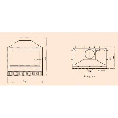 Топка Hark Rad 90 K имеет прямое стекло, боковое открытие дверцы, футеровка топки-шамот, рамка дверцы чёрная.
