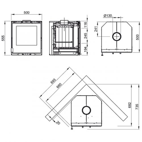 В комплектацию представленной топки с конвекционным кожухом входит вентилятор для горячего воздуха и кожух для разводки воздуха ( 2 патрубка диаметром 120 мм). Предусмотрены: двухуровневая система подачи воздуха, выдвижной зольный ящик, система очистки стекла.
