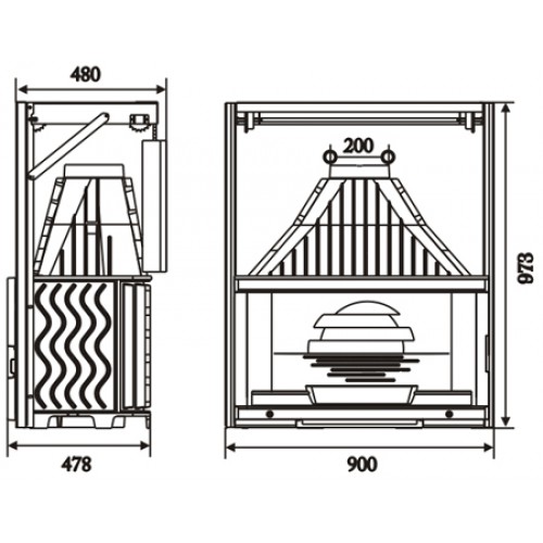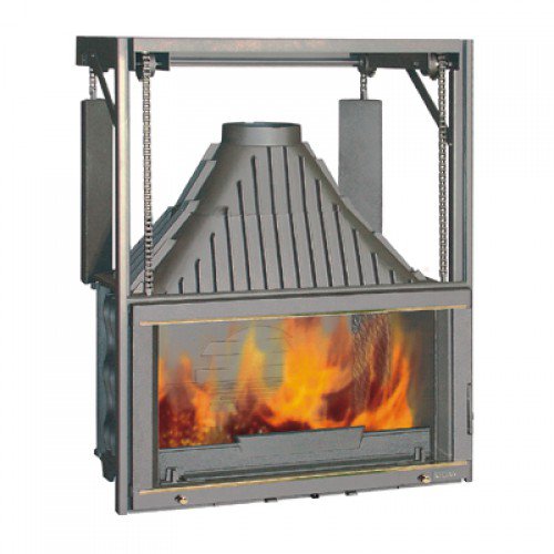 Чугунная топка с увеличенным обзором огня. Вертикальное и боковое открывание, система подъема двери при помощи контргруза.