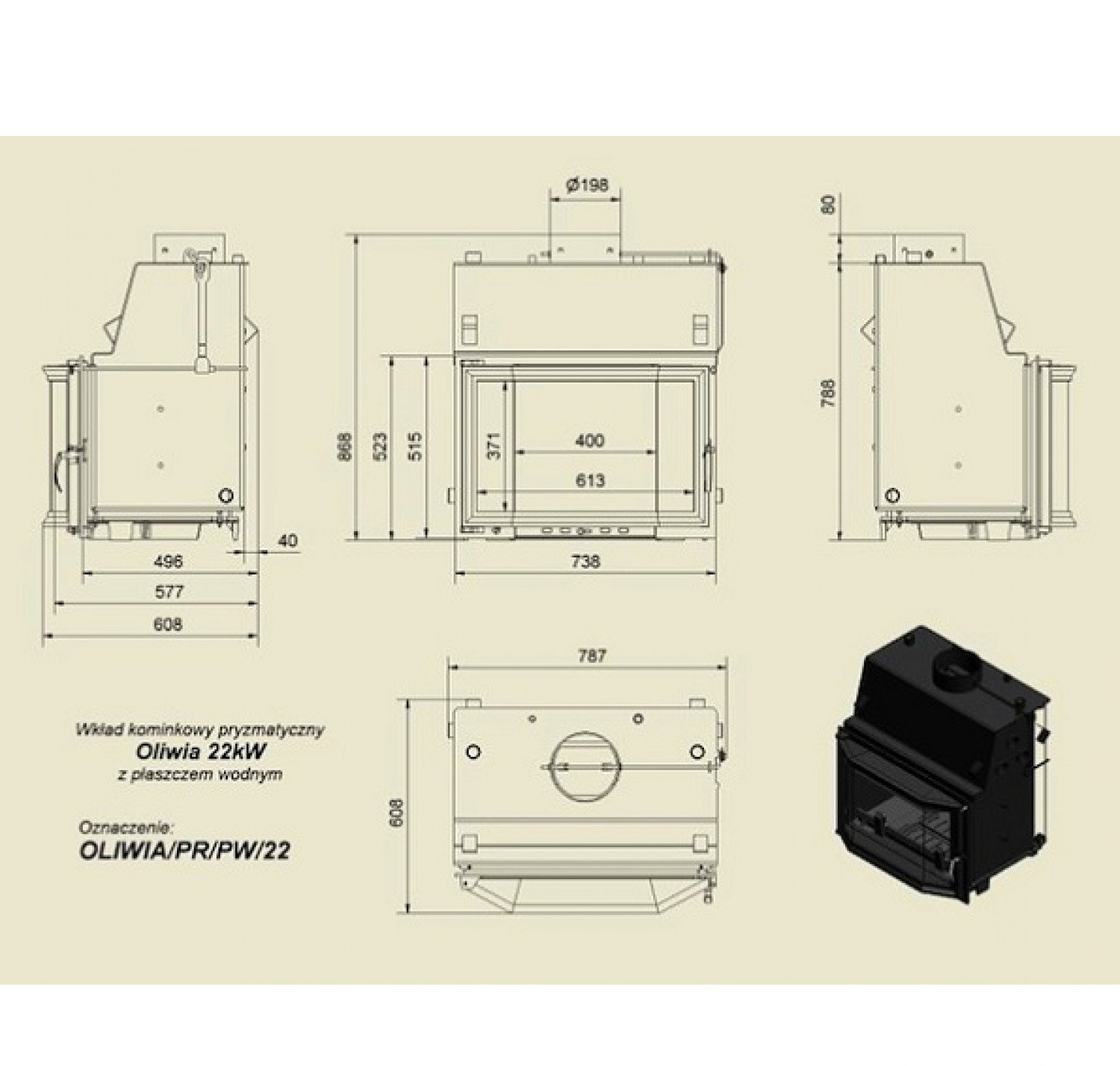 Oliwia PR/PW/17 (призма)— чугунные топочные камеры польского предприятия Kratki, производителя каминной продукции. Очаг закрытого типа, детали которого изготавливаются изтермоупорного чугуна испециальной котловой стали. Высокое качество деталей гарантируется использованием лазерных станков, с помощью которых вырезаются детали, а также листогибочных прессов CNC. Топка имеет водяной теплообменник, шибер, подачу воздуха в топку для горения возможно регулировать с помощью ручки, находящийся налицевой панели. Преимущества топок серии Oliwia PR/PW/17 отKratki: Топка закрытого типа снепрерывным горением ивстроенным водяным теплообменником мощностью 17 кВт иобъемом 35 л; Топка призматическим стеклом; Высокий дымосборник, присоединение дымоход сверху; Топливо— твердая древесина, коричневый уголь; Рама топки истанина изготовлены изтермоупорного чугуна; Топка с водяным теплообменником изготавливается изнелегированной листовой стали специальных сортов; в камере сгорания расположены дымоградные трубы увеличивающие поверхность теплообмена втопке; Термостойкое стекло Robax (порог температурной устойчивости 800 С); Система чистого стекла предотвращает быстрое загрязнение; Встроенный шибер, система съемной ручки; Возможность регулировки притока воздуха в камеру сгорания; Решетка надне камеры сгорания, ящик для сбора пепла; Накорпусе топки предусмотрены специальные ручки, предназначенные для удобства транспортировки; Держатель для дров, предотвращает рассыпание дров при открытии топки.