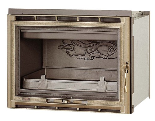Топка для камина, выполненная из толстого чугуна. Дверца с бронзовой рамкой. Прямое керамическое стекло для обзора огня. Система очистки стекла.