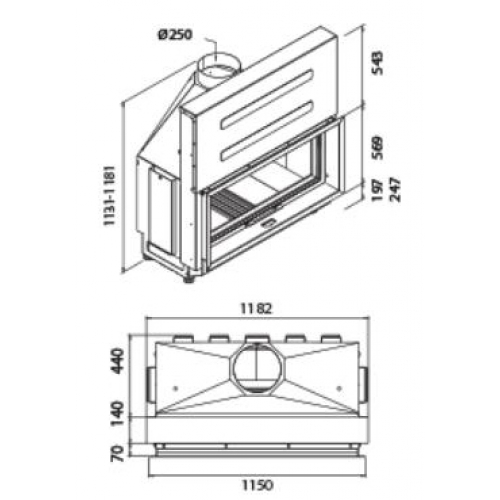 Большая каминная вставка-1,15м по раме - оборудована системами подачи внешнего воздуха для горения и системой самоочистки стекла, верхней подачи воздуха для горения(подовая топка). Стенки топочной камеры облицованы шамотным камнем, для предотвращения прогорания корпуса и увеличиния срока службы прибора.  Подьемный механизм двери, плавный и бесшумный, тросовый с использованием специальных подшипников качения. Вставка имеет регулируемые ножки для удобного монтажа.