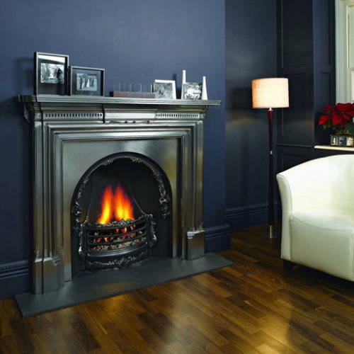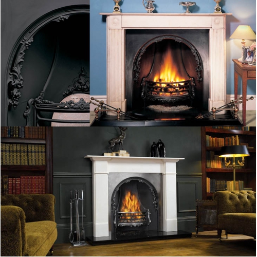 Art Nouveau - открытая чугунная каминная топка в английском стиле. Расположение топки фронтальное. Компактная каминная топка из чугуна со скошенными стенками изготовлена по старинным технологиям. Она украшена литым чугунным рельефом. Топка может быть декорирована изразцами, расписанными в технике итальянской майолики. Пол перед камином выложен плиткой и оформлен металлическим бортиком. Чугунные стенки этой топки хорошо отражают тепло в помещении. К тому же, боковые стенки топки всегда сужаются к стене, что повышает эффективность отражения тепла.