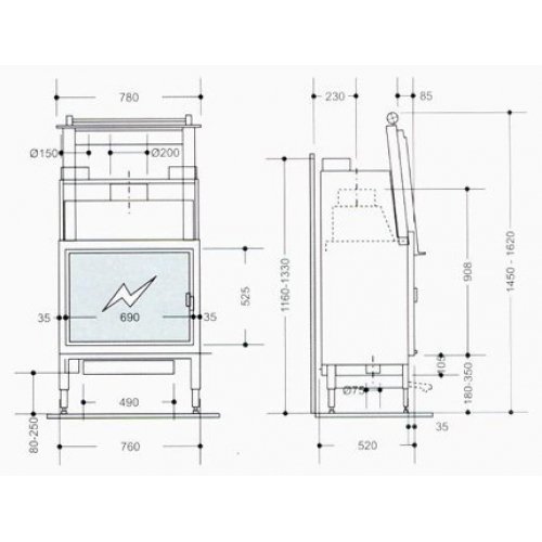 Универсальная топка изготовлена из чугуна. Плоское стекло. Подъемная дверца + боковое открывание.