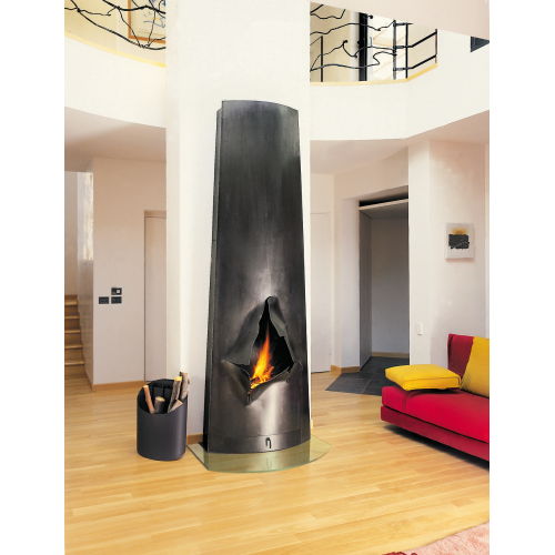 MAGNIFOCUS -необычайно представительный скульптурный камин. Избран для Premio Design Italiano (Рим). Сконструирован как единый блок из натертой воском неровной стали с видимыми сварными швами.