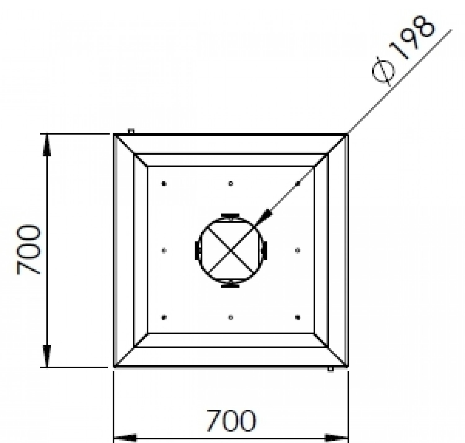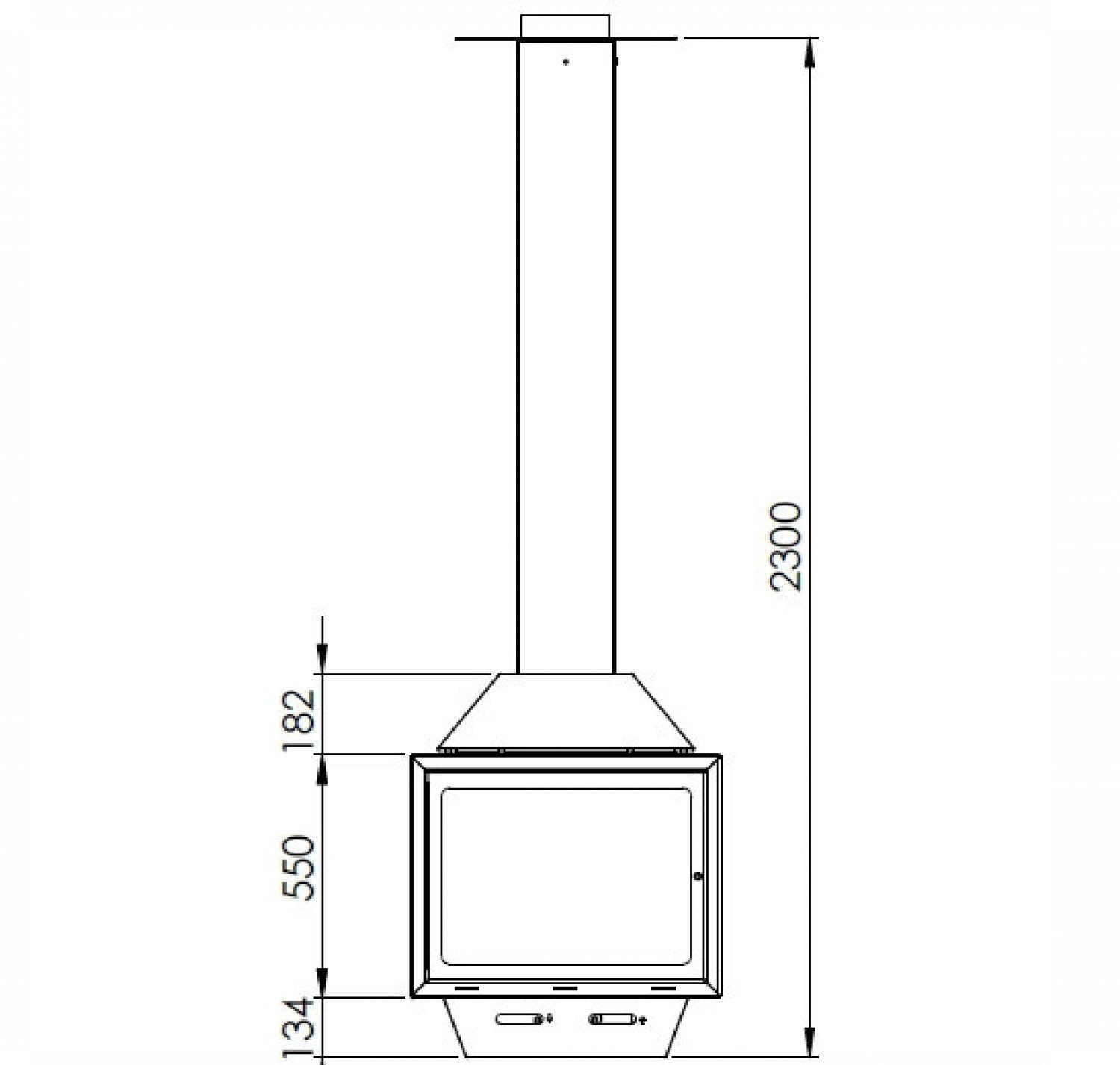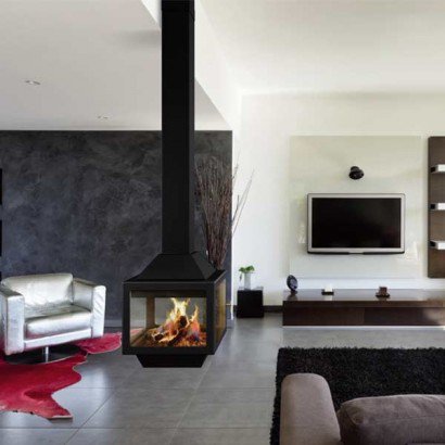 Центральный подвесной камин со стеклом и двойным верхним кожухом. Цвет - черный.