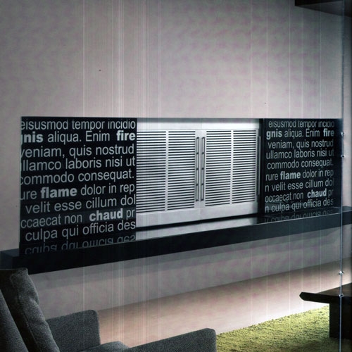 Пристенный камин с металлической плитой черного цвета. Защитный экран с направляющими модель Swing 120 Intro из нержавеющей матовой стали. Металлическая топка Class 120, с колосником и зольником. Стекла с тонированным краем.