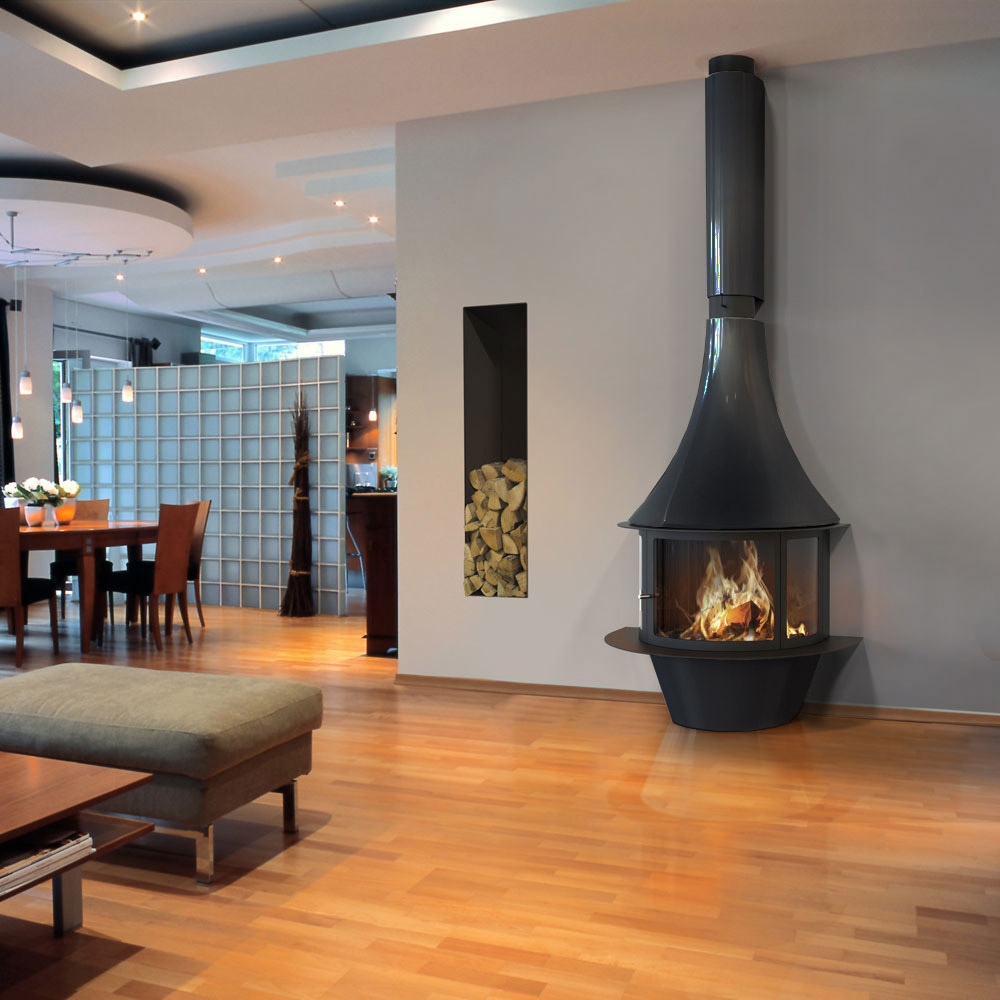 Фронтальный полукруглый дровяной камин Lorena для создания стильных изысканных интерьеров и оптимального отопления помещений. Компания Traforart, как и обычно, удивляет своих клиентов новаторством конструкторской и дизайнерской мысли. Камин LORENA имеет необычную полукруглую, и очень гармоничную и практичную конструкцию. Длинный элегантный дымоход плавно переходит в верхнюю полукруглую часть камина. Ниже идет сам очаг – застекленный и с удобными дверцами и просторными стеклами, которые открывают потрясающий вид на игру пламени с любой стороны. Заключительная нижняя часть, аналогичная по форме с верхним и топочным элементом камина, имеет удобную выступающую полку по всей окружности, которая выполняет как декоративные, так и практичные функции.