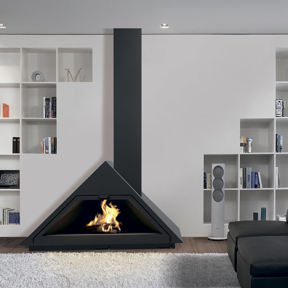 Фронтальный камин со стеклом. Вертикальная труба справа. Камин изготовлен из особой стали. Отделан огнеупорной черной краской, которая выдерживает температуру 650º.