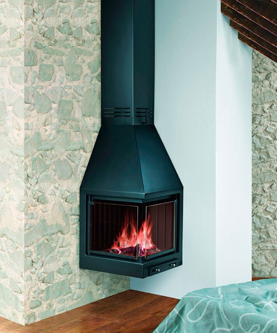 Подвесной угловой металлический камин с двойным защитным подвижным стеклом. Топка из толстой стали. Зольник с решеткой встроены в нижнюю часть камина. Снабжен телескопическим элементом, позволяющим варьировать высоту от 2,60 до 3,10 м (от потолка до пола) и крепежом к потолку, дымоход диаметром 17,5 см.