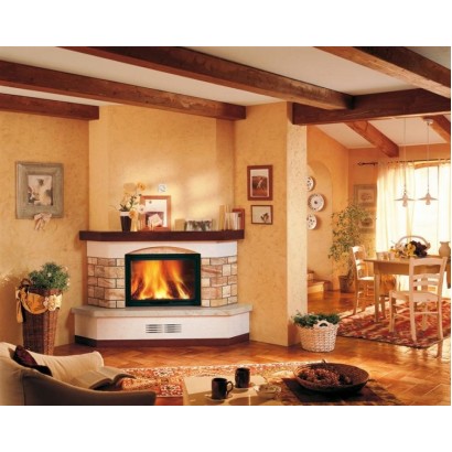 Угловой камин, выполненный из мрамора. По бокам камина кирпичная кладка из мраморных кирпичей. Плита под топкой сделана из серого мрамора. Вокруг камина декоративная деревянная балка. В самом низу предусмотрены отверстия для доступа воздуха.  Камин для деревенского дома всегда представлялся в виде старинной печки белого цвета, с большим жарочным пространством, в которое надо было закидывать дрова в самую глубь с помощью специальных длинных инструментов. Также в такой печи пекли хлеб, пироги, все, что угодно можно было приготовить в старинной русской печке. А это незабываемое ощущение, когда при работе печи слышен треск сухих поленьев в топке, которые горят, наполняя дом теплом и комфортом. Все эти моменты прекрасны. В современной действительности на смену печам пришли упрощенные варианты каминных приборов, которые весьма успешно составляют конкуренцию печам. Камины все также хорошо обогревают дом. Но их внешнее оформление поддалось влиянию дизайнеров, которые стали постоянно создавать интересные оригинальные модели каминов, способные удивить и обескуражить любого.  Поэтому для обустройства деревенского дома или дачи применяют современные модели каминов, которые выглядят значительно интереснее, чем печи, а выполняют свои функции очень профессионально. Камин Barga от итальянской компании Piazzetta наполнен натуральными компонентами в отделке, это мрамор бежевого оттенка полированной структуры, а по бокам топки мрамор имеет форму кирпичной кладки, что является оригинальным дизайнерским воплощением и становится необычным дополнением к общему стилю. Коллекция Rustici, представителем которой является камин Barga, наполнена моделями со схожими материалами, где зачастую присутствует имитированная кирпичная кладка. Камин Barga имеет закрытую форму топки, которая сможет полноценно протопить пространство дома, создать интересное сочетание теплоты огня и хорошего просмотра пламени. Топка закрытого характера способна сделать уникальное яркое сочетание хороших обогревательных способностей модели. В закрытом пространстве горению дров ничто не мешает протекать долго и функционально обогревать дом. При высокой тепловой отдача, обеспеченной КПД не ниже 70%, происходит хорошая экономия дровяного топлива. Камин для деревенского дома лучше всего выбрать в оригинальной форме, которая подчеркнет интерьер и стилистику характерного помещения. Камин Barga также имеет деревянную отделку, в которой сделана каминная полка, применена древесина ели, прочная и экологичная.