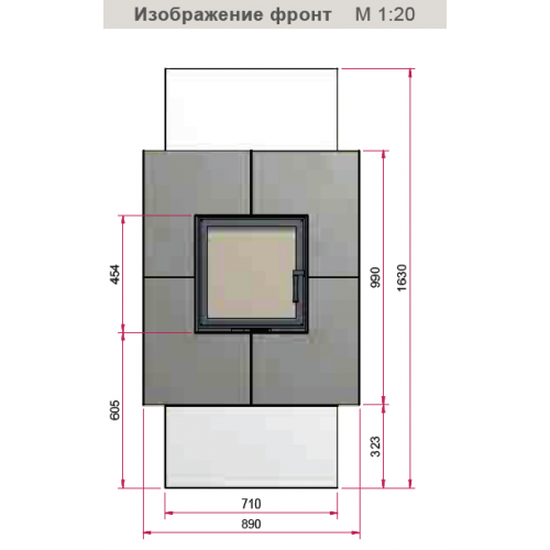 Камин состоящий из строительных элементов, выполненных из высококачественного теплонакапителя, рамка вокруг топки выполненна из стали.