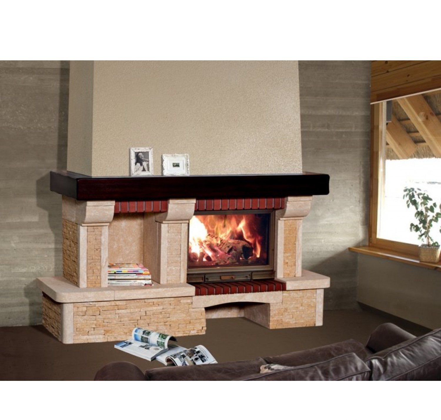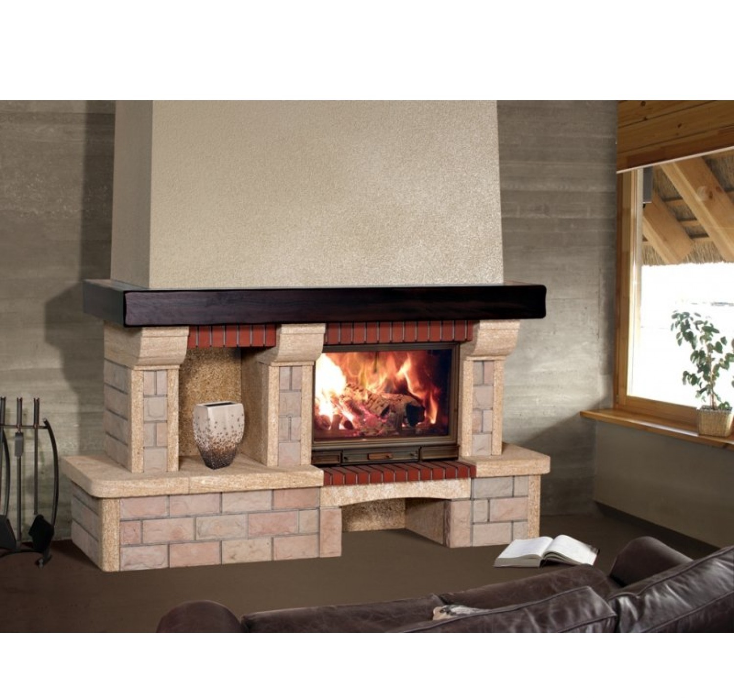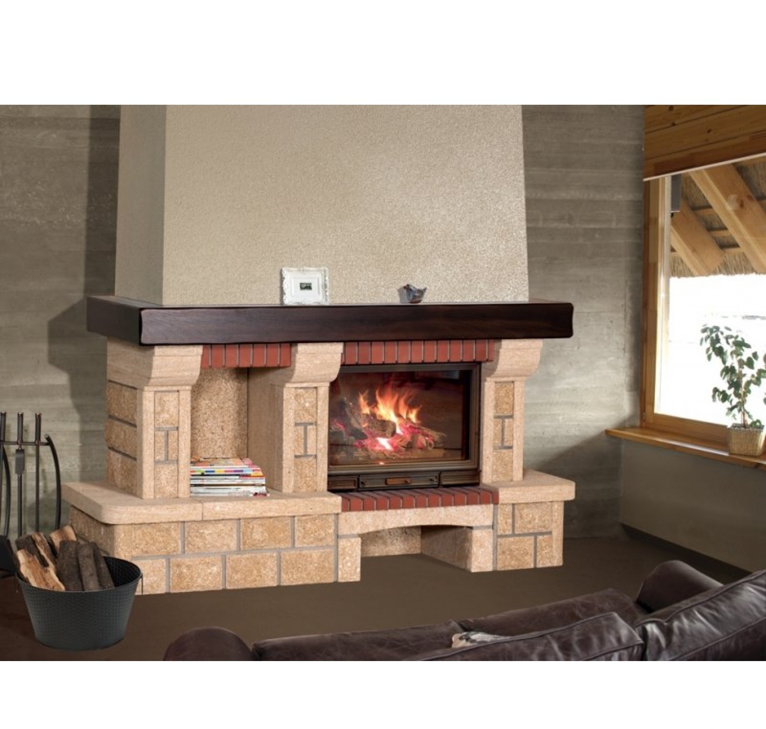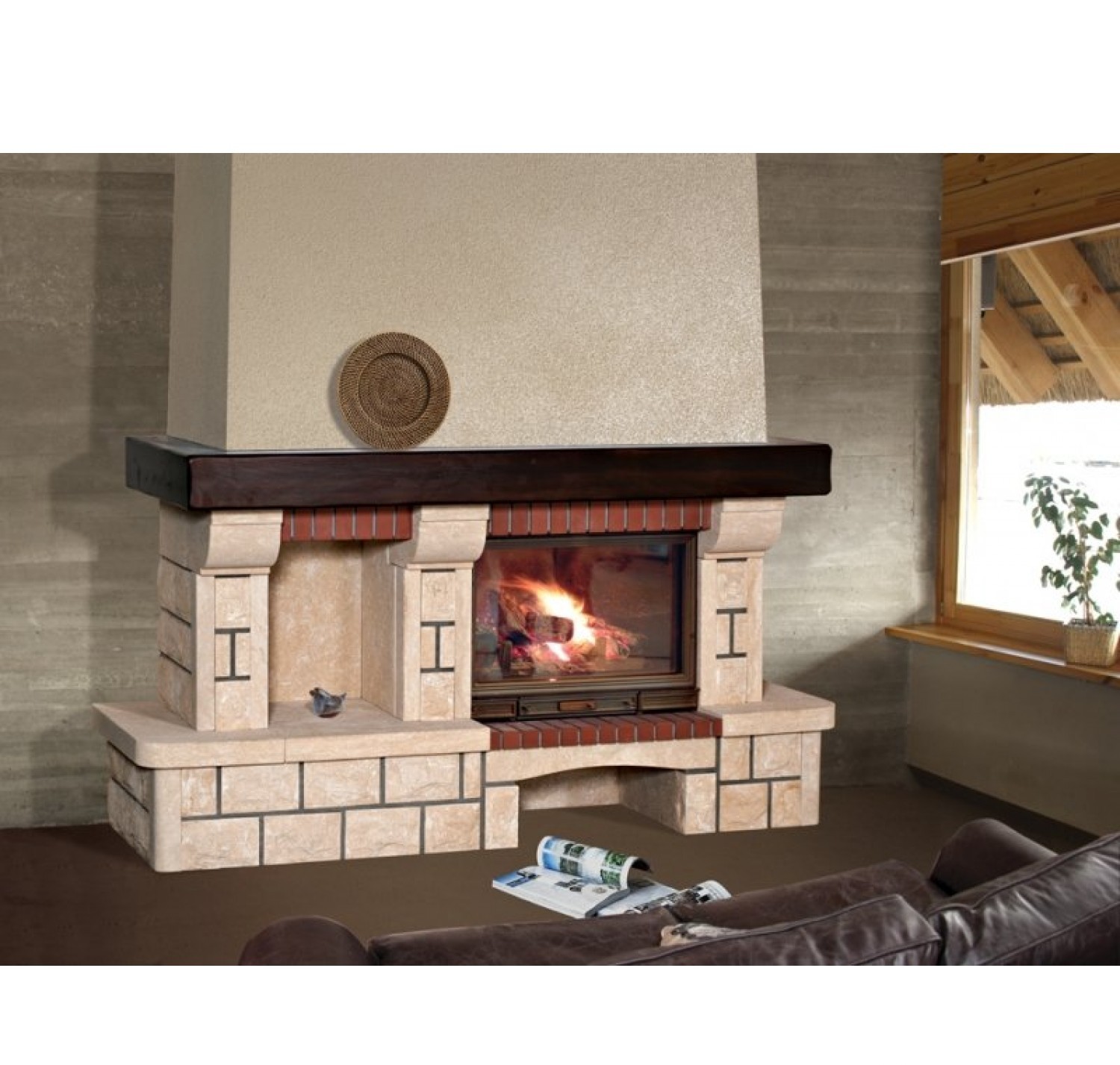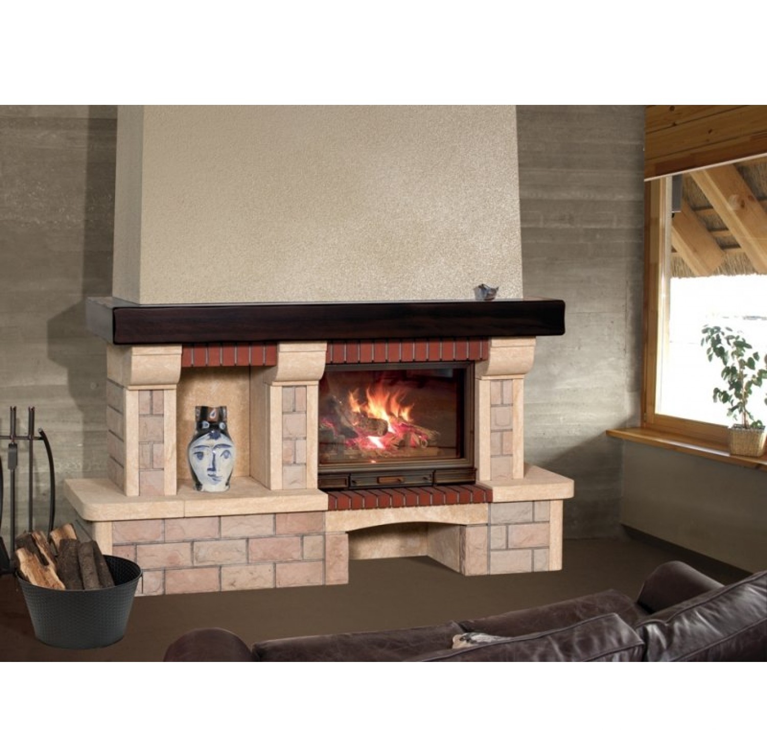 Детали камина (залиты в блоках) выполнены из ракушечника Du Gard (Франция) и доломитa (Латвия). Плита перед топкой из красного кирпича. К данной модели подходят многие дровяные топки, что позволяет подбирать конфигурацию исключительно на свой вкус. В данной модели предусмотрена ниша для размещения предметов интерьера. Широкий камин Sunhill Bremen, оснащенный просторной дровницей и вместительной полкой из массива дуба, рационально использует отведенное для него пространство, предоставляя место для вещей, дорогих Вашему сердцу подарков и сувениров. Камин адаптирован под топку компании Seguin с боковым дополнительным стеклом. Чертеж Sunhill Bremen