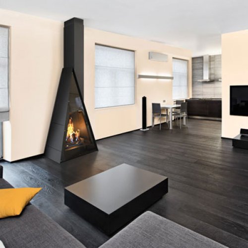 Интересная модель от компании Traforart треугольной конструкции – камин Breda. Разрабатывая эту модель, талантливые конструкторы и дизайнеры компании решили отойти от привычных наскучивших форм и разработали оригинальную конфигурацию камина в виде треугольника. Четкие пропорции, сбалансированные линии прекрасно сочетаются с черным стильным цветом боковых частей облицовки и красивым цветовым исполнением фронтальной части.